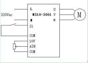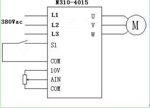 每套設(shè)備使用0.75KW變頻器和11KW變頻器;N310-2001-H1X負(fù)責(zé)拖動牽引電機帶動牽引輥對吹塑好的薄膜進(jìn)行牽引;N310-4015-H3X負(fù)責(zé)拖動擠出機;牽引電機規(guī)格為0.75KW,50HZ,3.1A,1400RPM,帶有減速機;擠出電機規(guī)格為:380V,11KW,22.6A,1400RPM,50HZ,帶冷卻風(fēng)機,規(guī)格為95W,380V,50HZ,1400RPM;