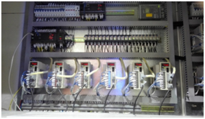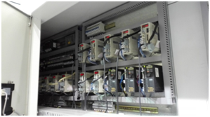 兩臺PLC主機(jī)之間通過CAN open實(shí)現(xiàn)數(shù)據(jù)交換,同時(shí)控制13套JSDEP系列伺服,3臺S310+變頻器,并通過10寸HMI實(shí)現(xiàn)人機(jī)交互。